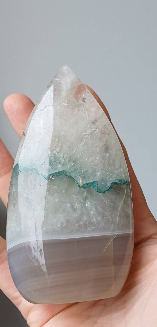 Prachtige agaat sculptuur met kwarts en vele regenboogjes. De groene lijn is mogelijk bijgekleurd.