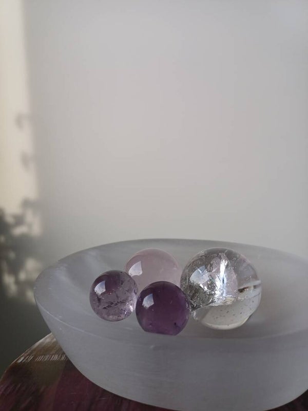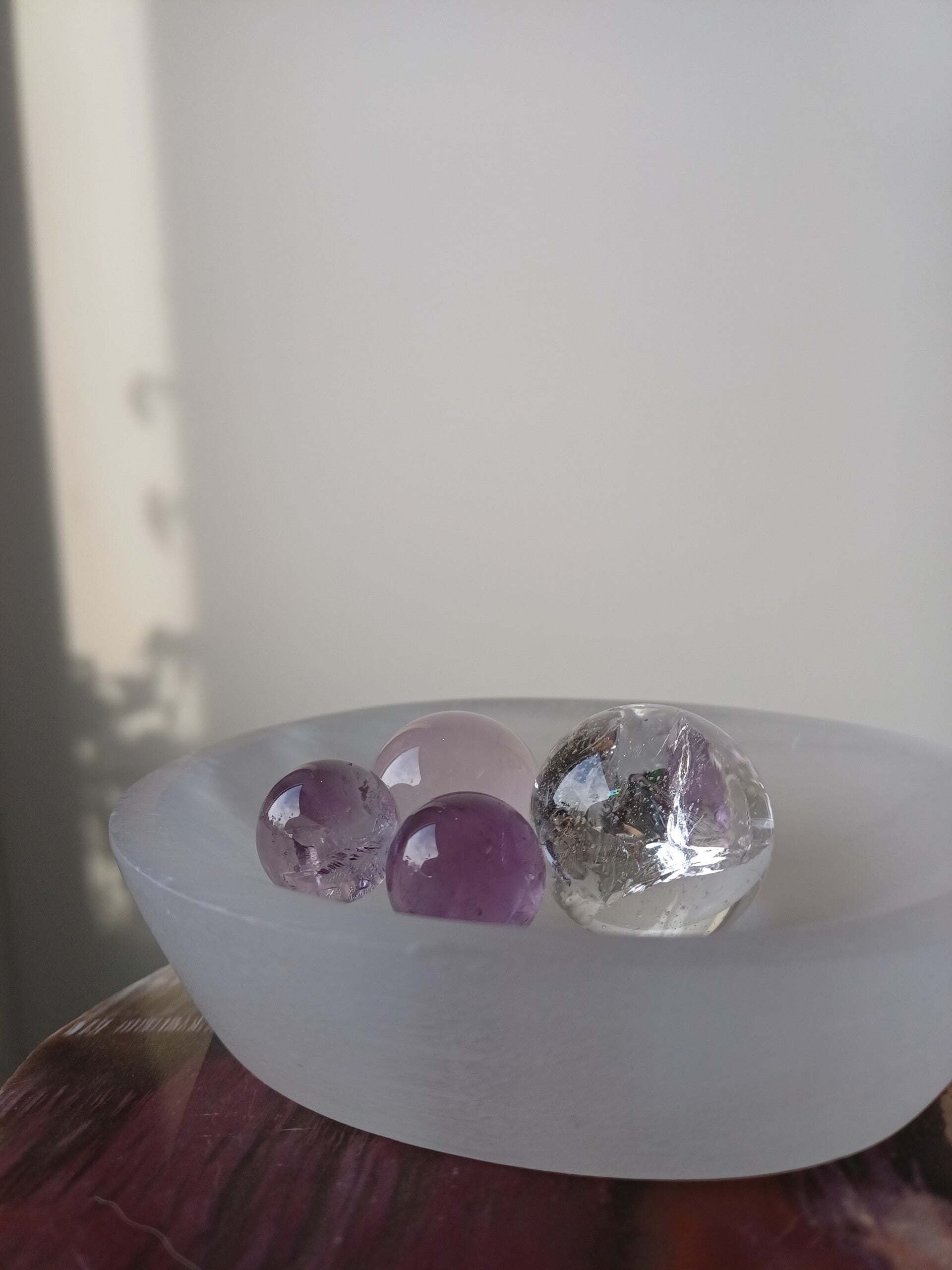 Mooie gouden driehoek set bestaande uit twee amethist bolletjes, één rozenkwarts en één bergkristal bol.