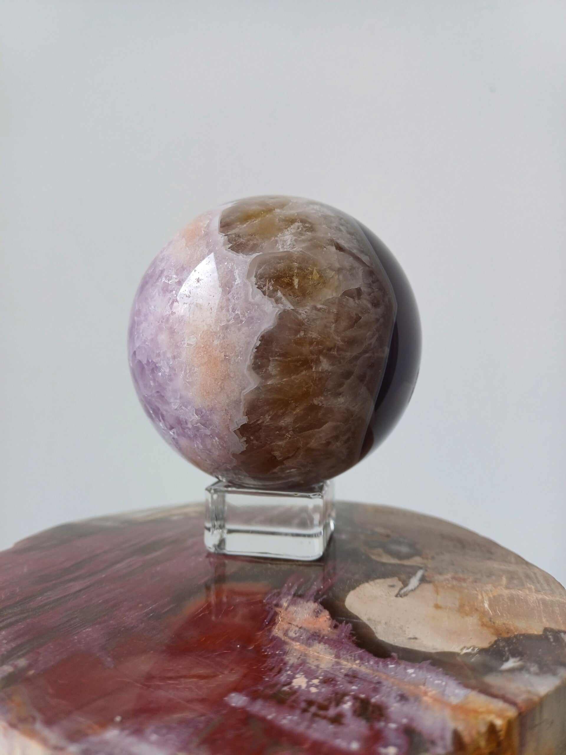 Prachtige agaat met amethist bol. Ook de regenboogjes ontbreken niet. Erg mooi.