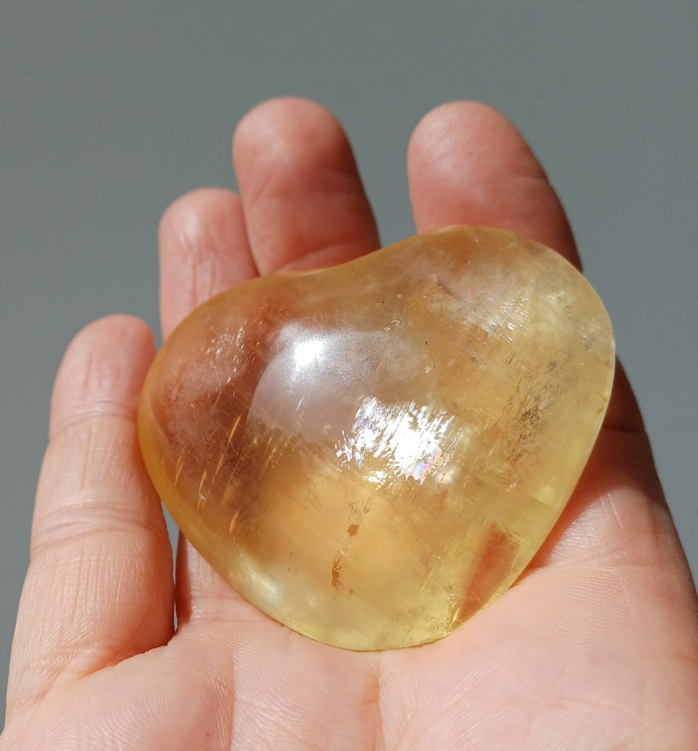 Van prachtige kwaliteit is dit honing calciet hart. Vol met regenboogjes. Erg mooi.