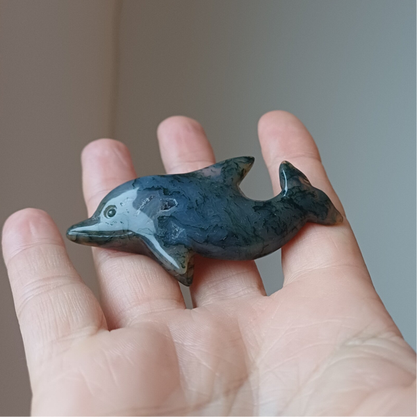 Prachtige mosgaat dolfijn met druzy. Kan goed op zichzelf staan.