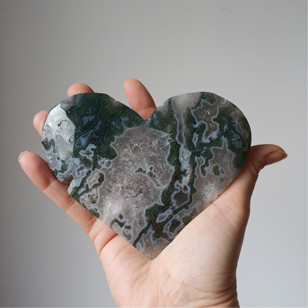 Prachtige groot mosagaat hart op goudkleurige standaard.