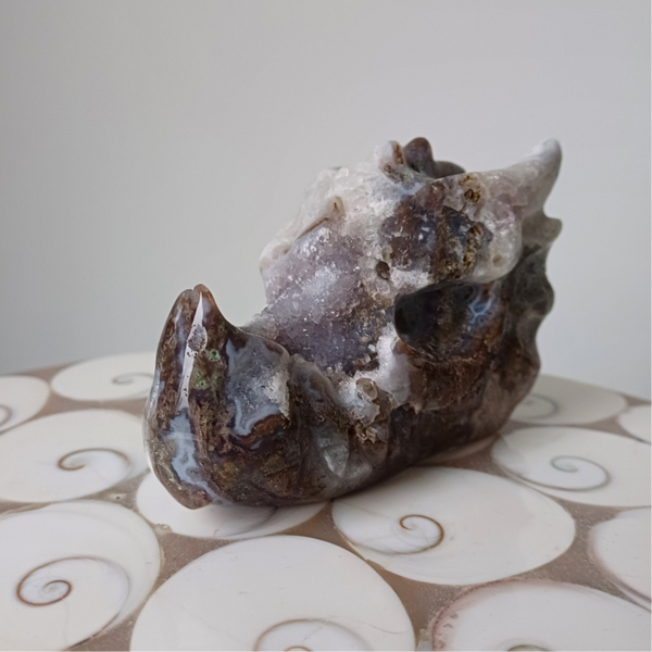 Mooie mosgaat drakenschedel met allerlei twinkelende druzys. De draak heeft wat imperfecties, maar een grote aantrekkingskracht.