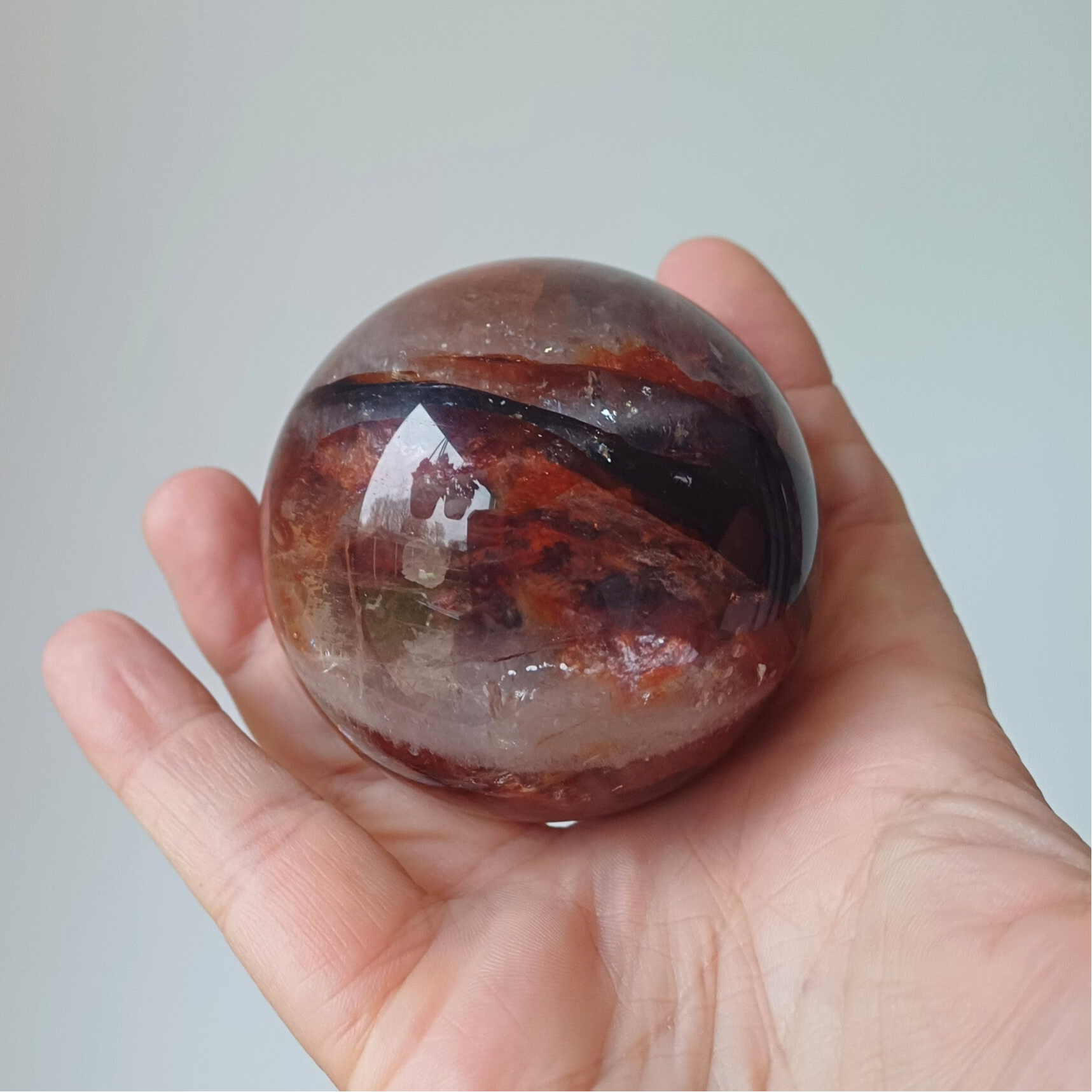 Prachtige hematoïdekwarts bol met heldere vensters en allerlei regenboogjes. Ook mooi op een lichtbron.