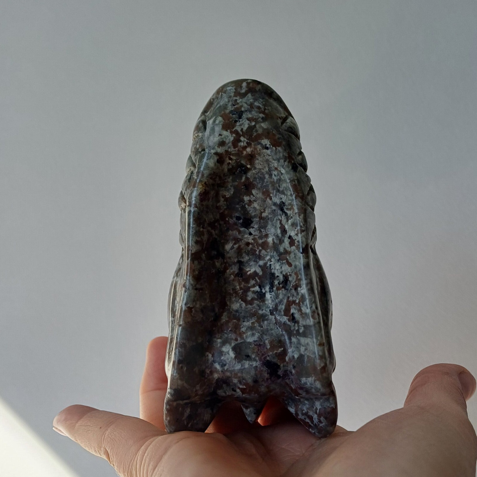 Syeniet met sodaliet (Yooperlite) carving (drakenschedel) met uv-reactie