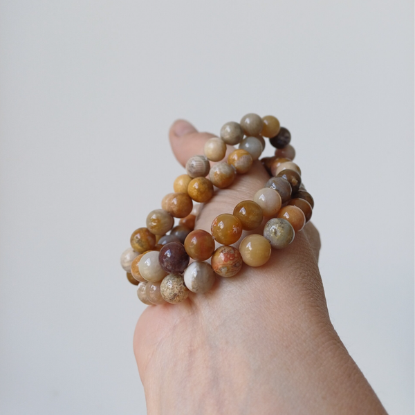 Prachtige versteend koraal armband met kralen van circa 8 mm.