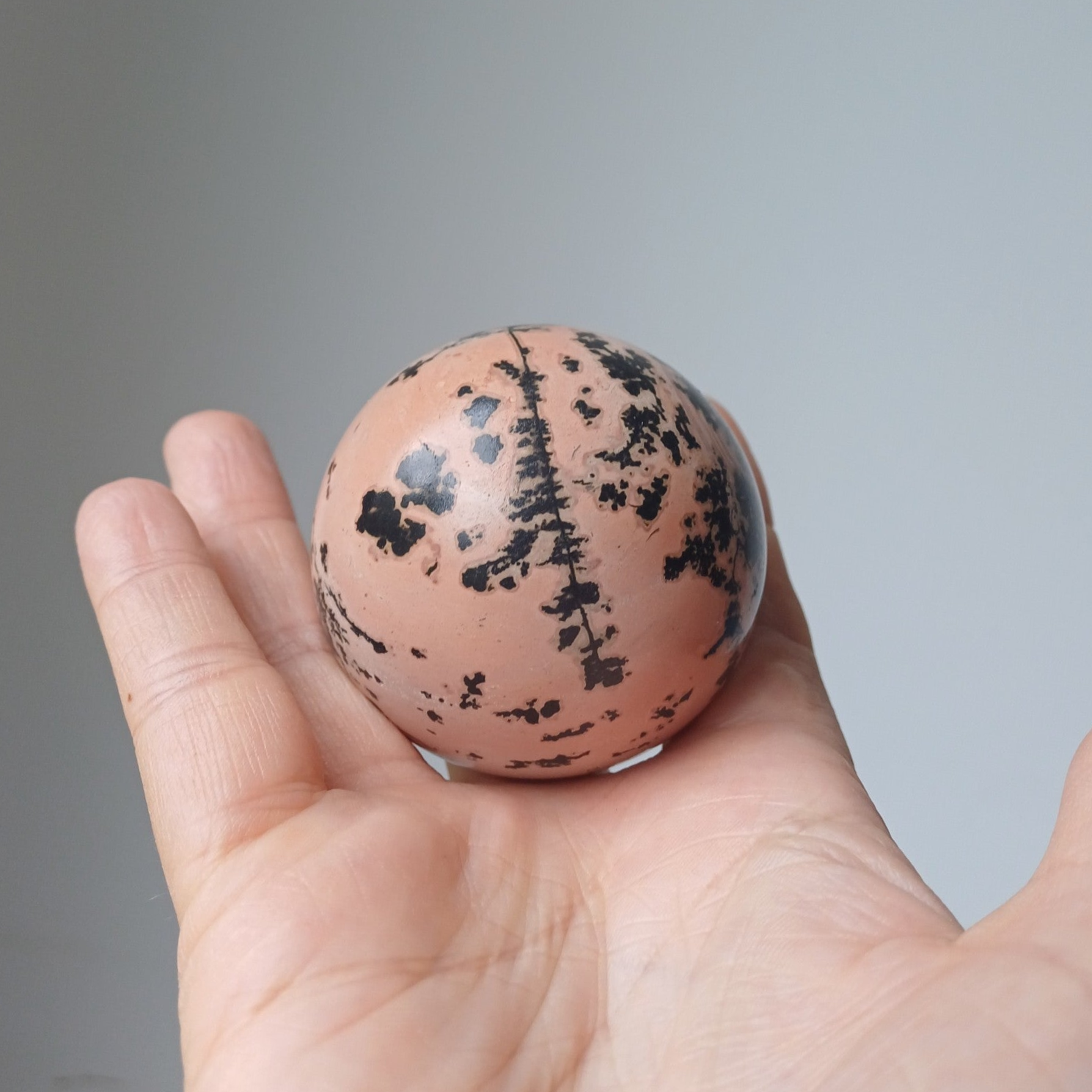 Prachtige bol van landschapsjaspis uit China. Net een kunstwerkje. De dendriet die je ziet, die eruit zien als takken, zijn een natuurlijk gevormd mineraalpatroon. Wat zorgt voor een schilderachtig geheel. Dendriet staat symbool voor groei, verbondenheid en innerlijke rust. Het helpt je om contact te maken met de natuur en je diepere zelf.