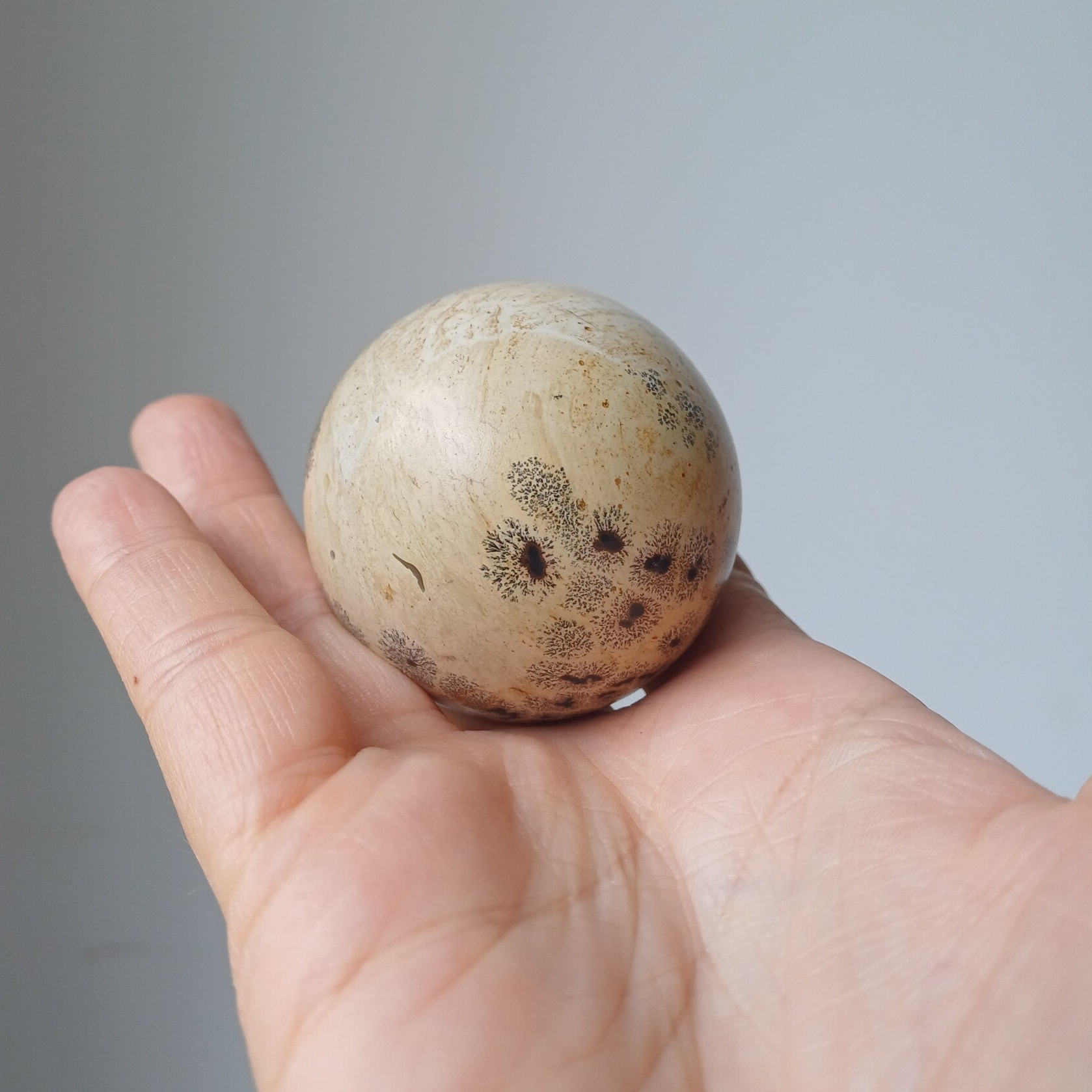 Prachtige bol van landschapsjaspis uit China. Net een kunstwerkje. De dendriet die je ziet, die eruit zien als takken, zijn een natuurlijk gevormd mineraalpatroon. Wat zorgt voor een schilderachtig geheel. Dendriet staat symbool voor groei, verbondenheid en innerlijke rust. Het helpt je om contact te maken met de natuur en je diepere zelf.