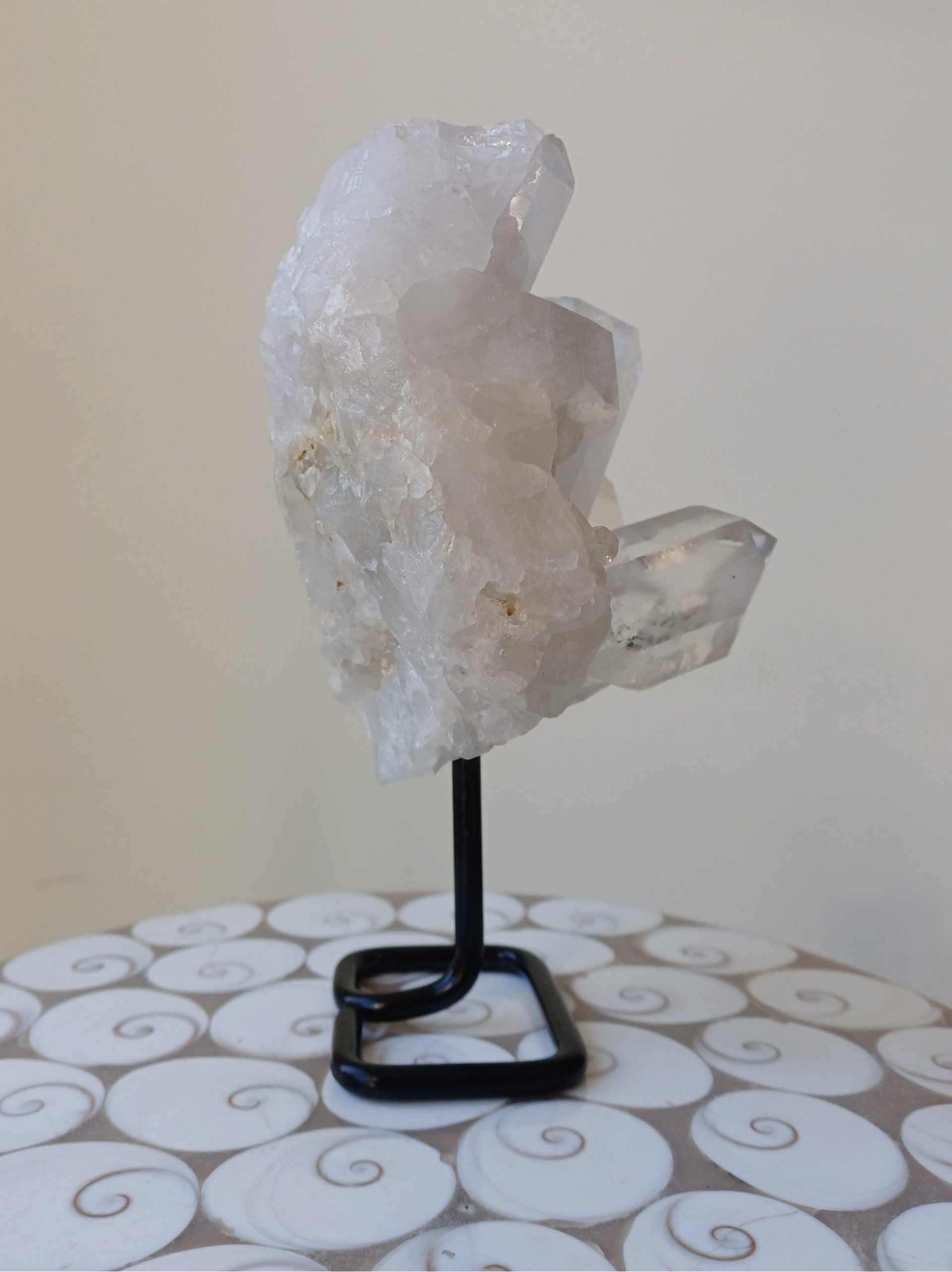 Prachtig zwaar bergkristal cluster op zwarte pin.