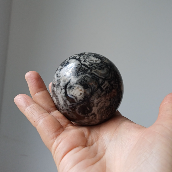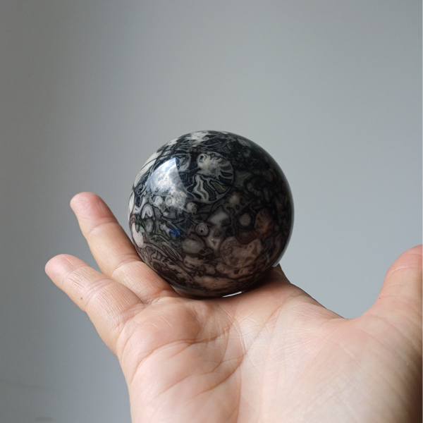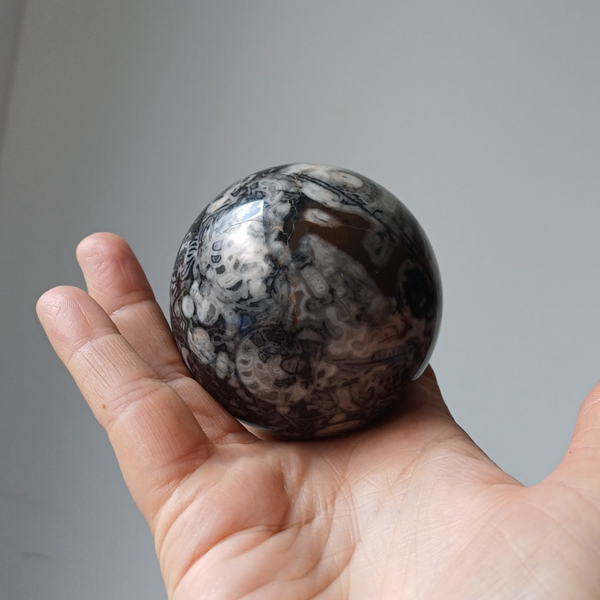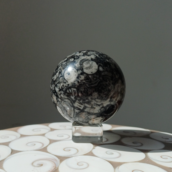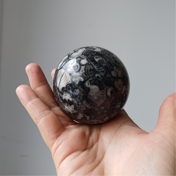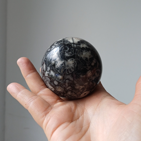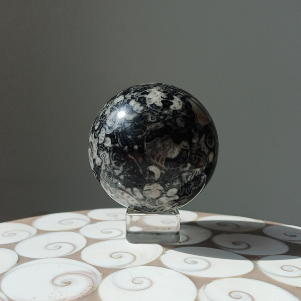 Prachtige grote bol met daarin allerlei versteende fossielen opgenomen. Uniek.