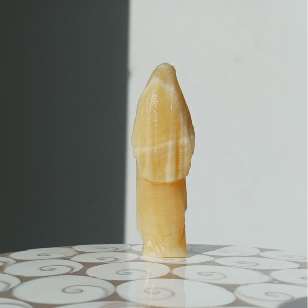 Mooie carving van de heilige Maria met kindje Jezus van oranje calciet.
