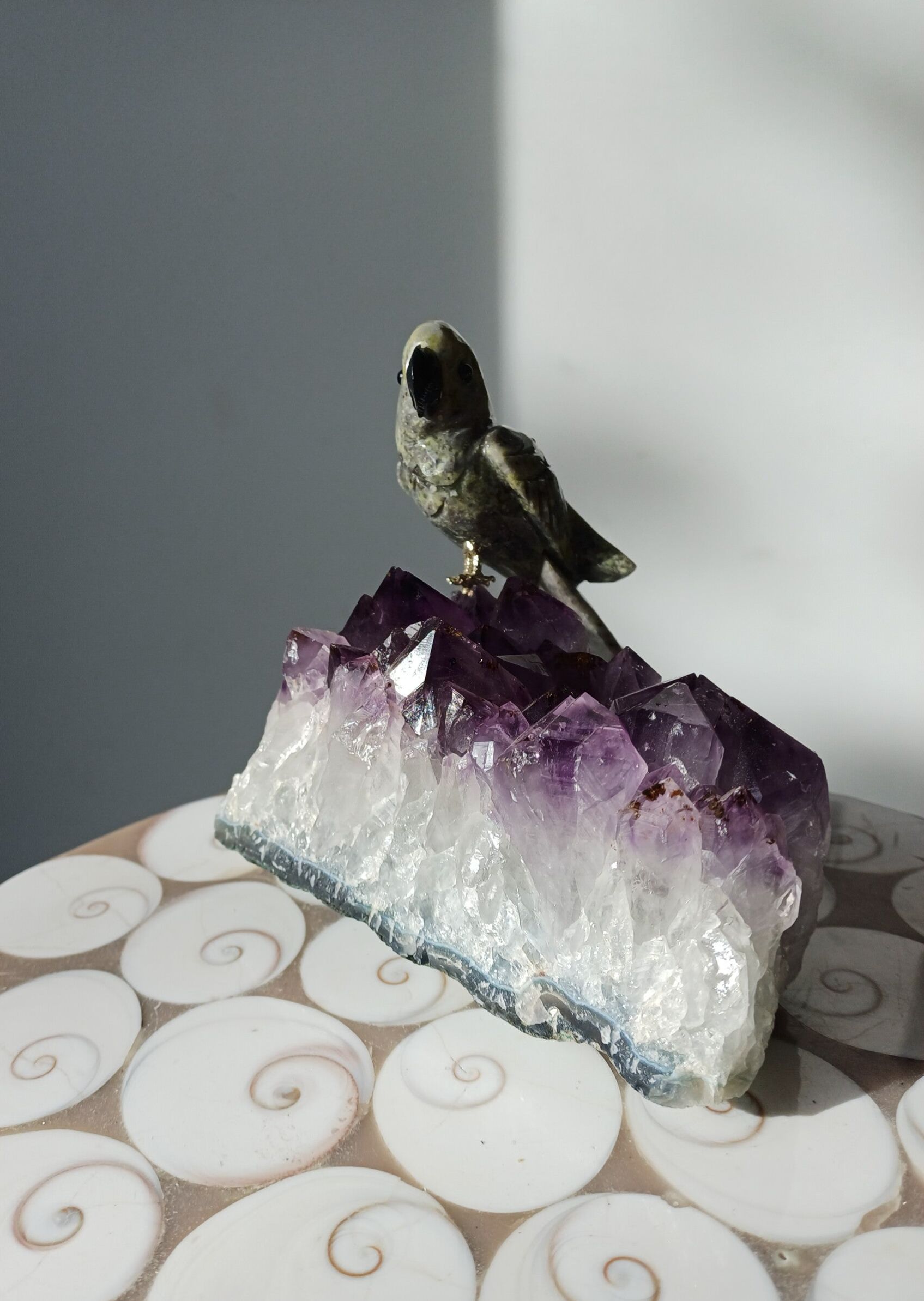 Mooi amethist cluster met daarop een jaspis papegaai.